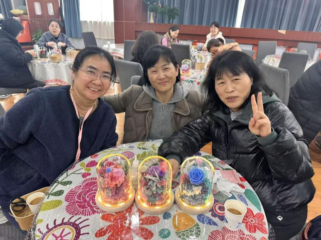 活动现场,温馨满溢。在专业老师悉心指导下,女教工们精心挑选花材,巧妙构思布局,将干花悉心搭配,制作出独具匠心的小夜灯。制作期间,大家相互交流、分享灵感,欢声笑语不断。